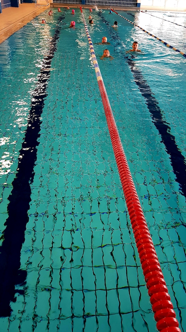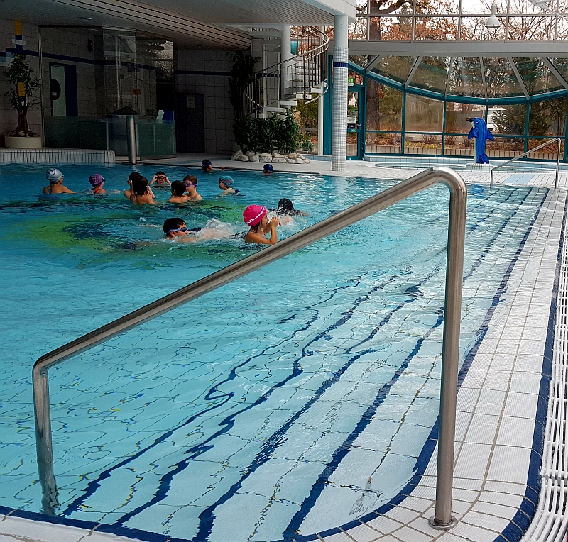 Die Kinder, die bereits schwimmen können, werden auf zwei abgetrennten Bahnen im großen Schwimmbecken unterrichtet, die Nichtschwimmer im stehtiefen Becken.