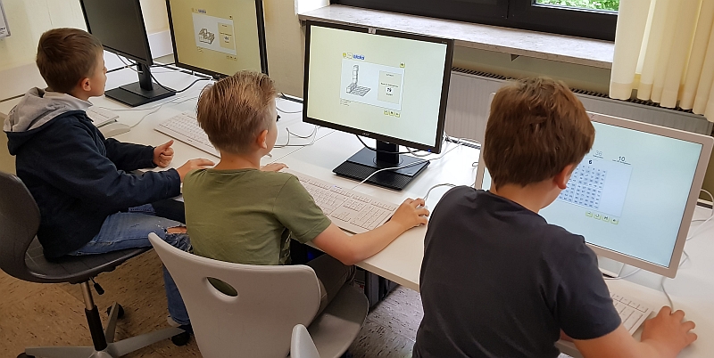 Der vorhandene Computerraum mit 25 Schülerarbeitsplätzen wurde nach und nach durch Computerinseln in den 12 Klassenzimmern des Haupthauses ergänzt.